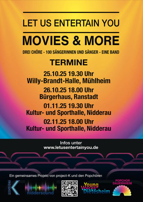Die über 100 Sängerinnen und Sänger planen Großes: Gemeinsam werden sie unter dem Titel „LET US ENTERTAIN YOU“ ein abendfüllendes Konzertprogramm präsentieren. Die diesjährige Ausgabe der mittlerweile schon bekannten Konzertreihe steht unter dem vielversprechenden Motto „MOVIES AND MORE“. Präsentiert wird das Konzert in der Willy-Brandt-Halle in Mühlheim von den Concordia-Chören Dietesheim, zu denen die Young Voices auch gehören.