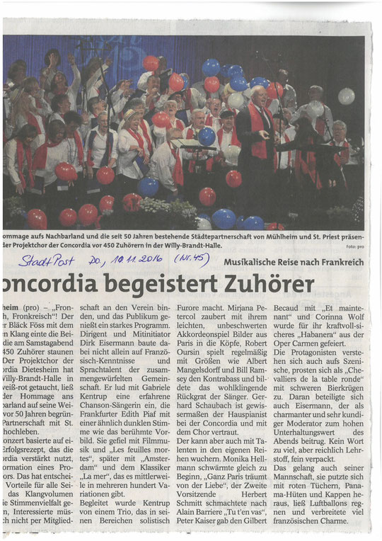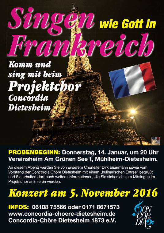Die Concordia Chöre Dietesheim bieten für ein ausgesuchtes Projekt in 2016 Sängerinnen und Sängern an, den Chor ab Januar bis November 2016 mit ihren Stimmen zu unterstützen. Der Name des Chorprojektes wird heißen: „Singen wie Gott in Frankreich“ und die Literatur wird aus französischer Chormusik aus verschiedenen Epochen sowie bekannte Chansons bestehen. Wer nun glaubt, dass er ungeeignet dafür ist, da er kein Französisch spricht bzw. singt, der darf beruhigt sein. Die Lieder werden zum Großteil in Deutsch gesungen und die französischen Texte werden den Chormitgliedern in Lautschrift zur Verfügung gestellt. Wer sich fragt, warum Französisch? Die Stadt Mühlheim feiert in 2016 die 50 jährige freundschaftliche Partnerschaft zur Stadt St. Priest. Wir finden, dass ist Grund genug diese langjährige Beziehung mit einem besonderen Event in Form eines Konzertes zu würdigen.